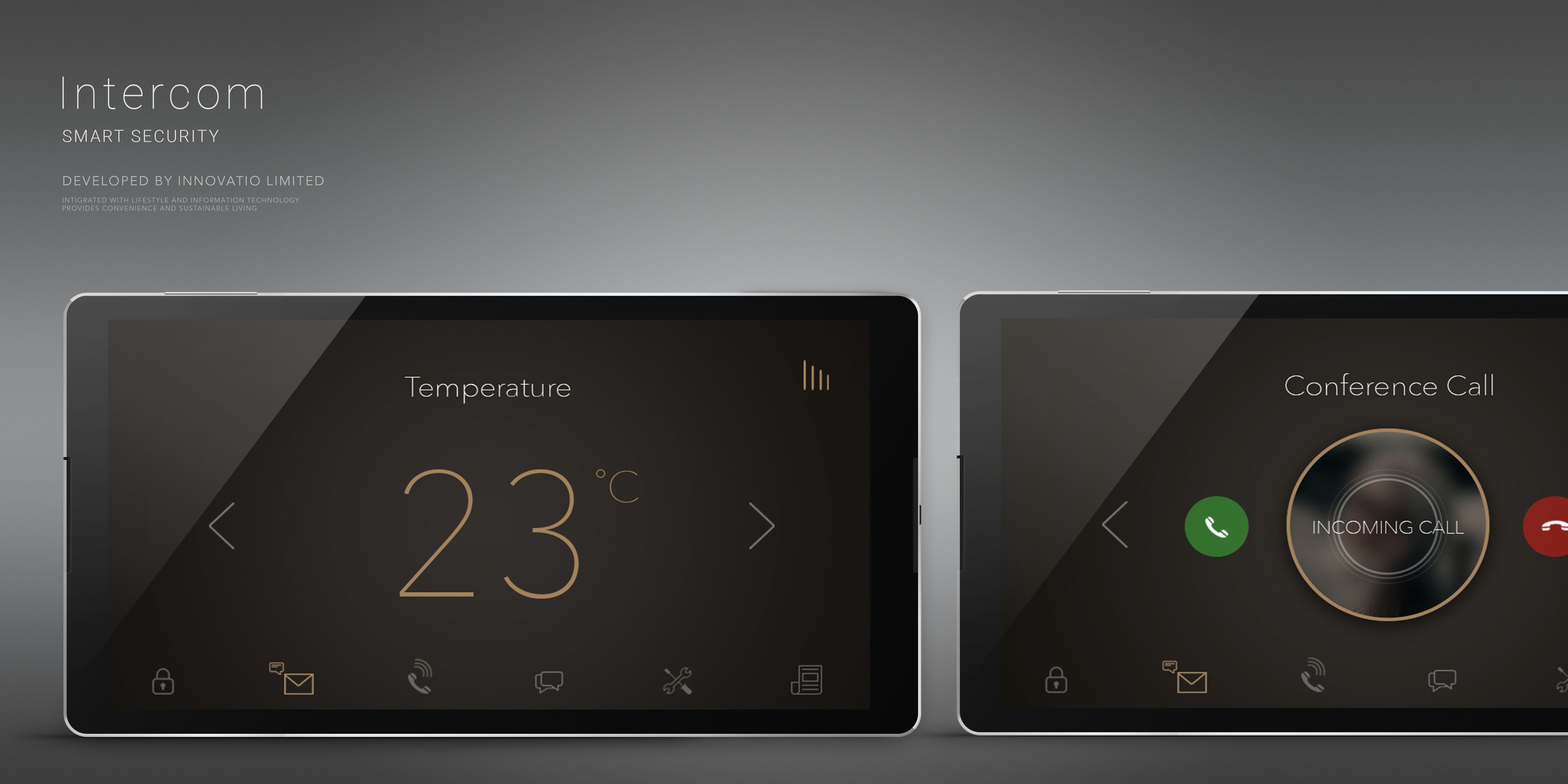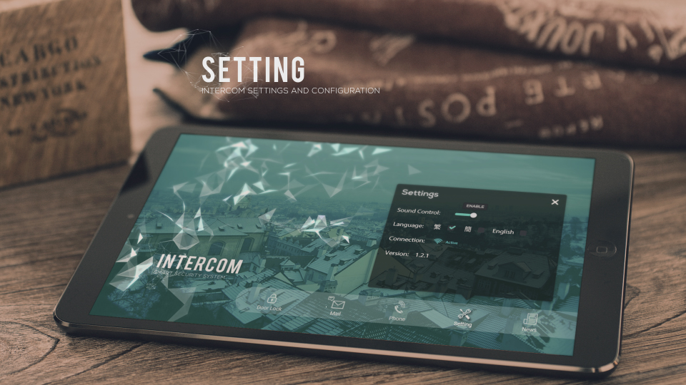 This is the first edition of Intercom smart security system interface screen layout. Dark green filtered landscape image background with stylish abstract pattern produced a high-tech look and feel for the user.